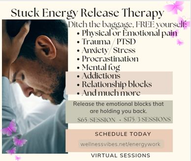 This session features blend of kinesiology (muscle testing), the subconscious mind and intuitive guidance to find address and release trapped energy or emotions in a compassionate non judgemental manner.